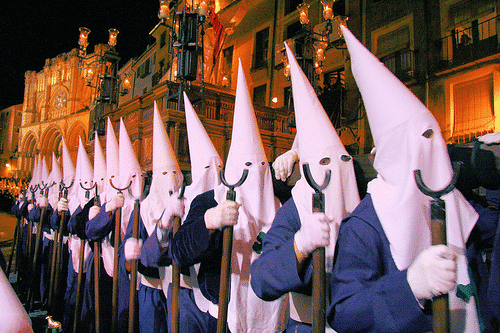 Click here for a full article regarding the true origins of the robes and the high-coned hats worn by the KKK. These like everything else are Satanic in origin. The "bed sheets" account is nothing more than rewritten and falsified history, as the Catholic Church [which has nothing of its own] has used these costumes, red, white and black included during their "Holy Week" processions in Spain for at least 2-300 years, as seen in the photos here. [This is covered in the article]