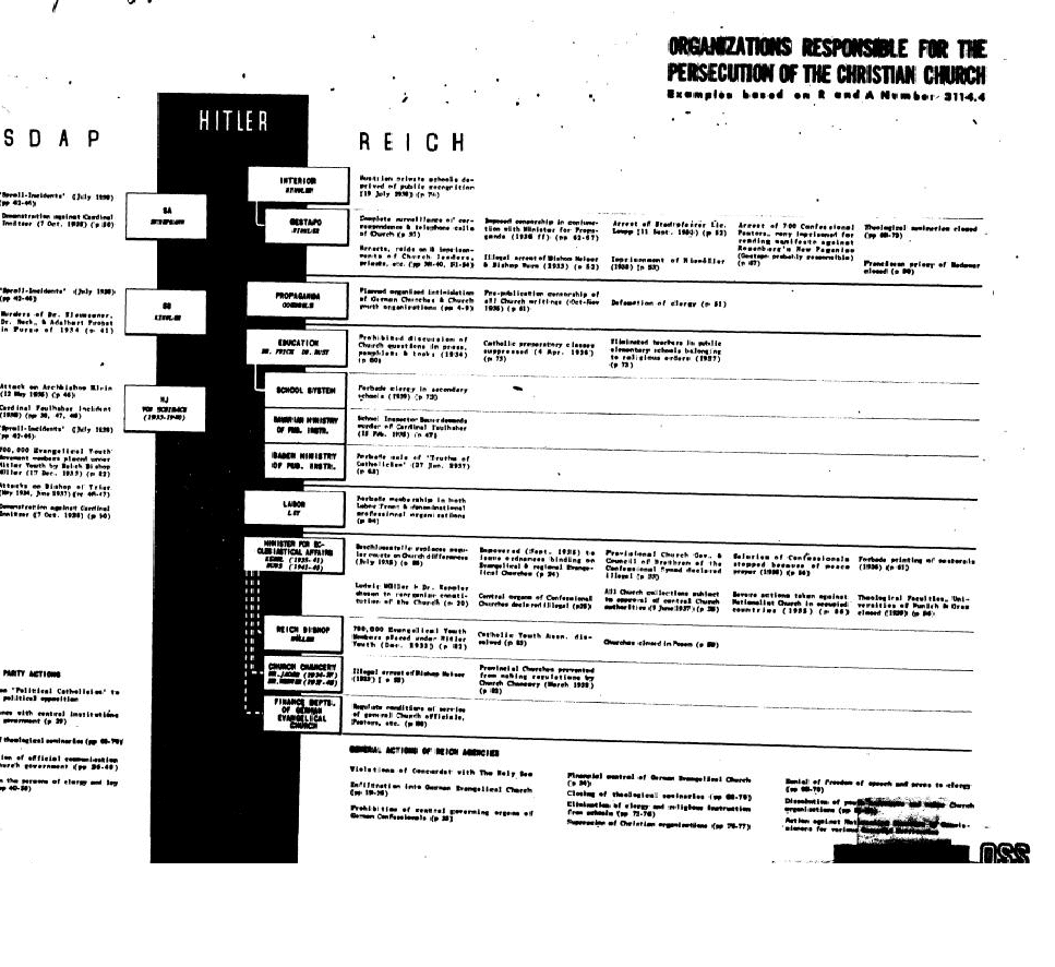 The documents have been scanned from typescript and are to be posted every 6 months, with additional scholarly commentary published "on a rolling basis." The first installment is a July 1945 report by the Office of Strategic Services, "The Nazi Master Plan: the Persecution of the Christian Churches," with commentary by two British scholars on the persecution of religion as a war crime. The report describes government interference in churches in Germany and countries under Nazi control, intimidation, and banning of certain denominations, and arrests and murders of clergy. Links to other relevant websites are planned for the future.